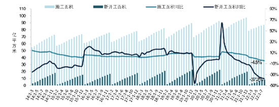 2014年至今全国房屋累计新开工和施工面积及其同比增速。来源:中指数据CREIS,国家统计局