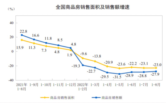 2021年1月-2022年8月,全国商品房销售面积及销售额增速。来源:国家统计局