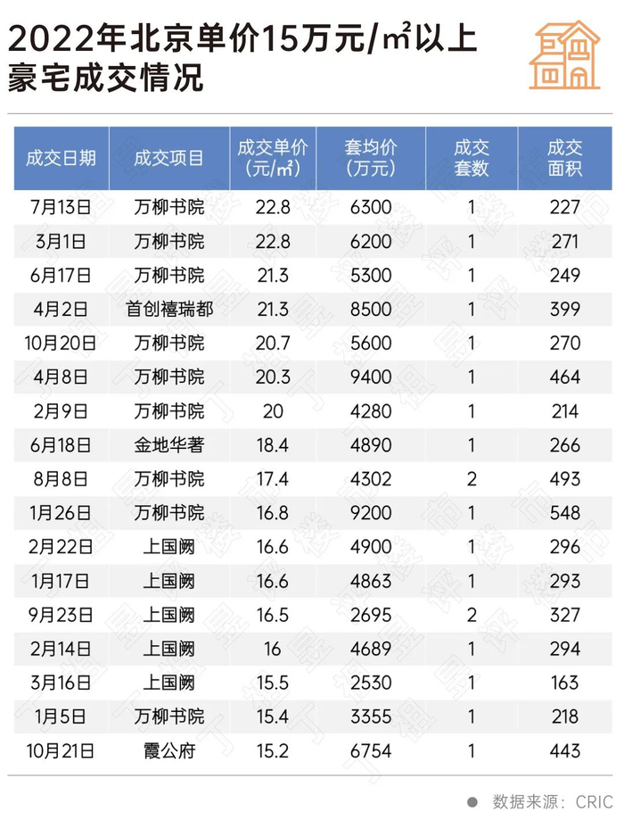 CRIC数据显示,2022年,北京单价15万元/平方米顶豪共成交了19套,其中万柳书院贡献了10套,占总成交量的一半以上。