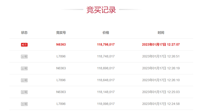 1月16日上午竞拍刚开始便有人出价,随后多位买家跟进,距离原定结束时间尚有30分钟,出价已超过8000万元。随着出价超过1亿元现场形势也逐渐明朗:由此前的多人混战转入两强争霸,二位意向买家鏖战200多轮后将价格定在了118798017元。