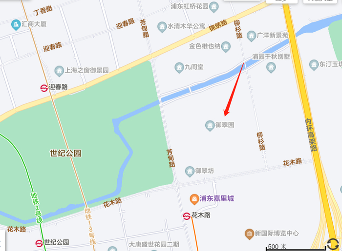 御翠园由李嘉诚旗下的和记黄埔打造,2004年建成,共有404户,作为内环内规模最大的高档别墅社区,御翠园地理位置优越,西边即世纪公园,南边是上海新国际博览中心,北边是富豪聚集的九间堂别墅。