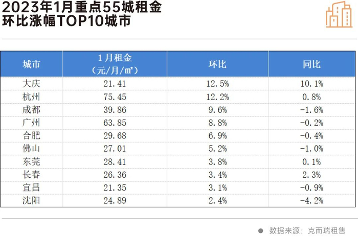 再来看租金。克而瑞租售监测的55城中,1月有超过六成城市租金环比上涨,环比最大涨幅达到12.5%。