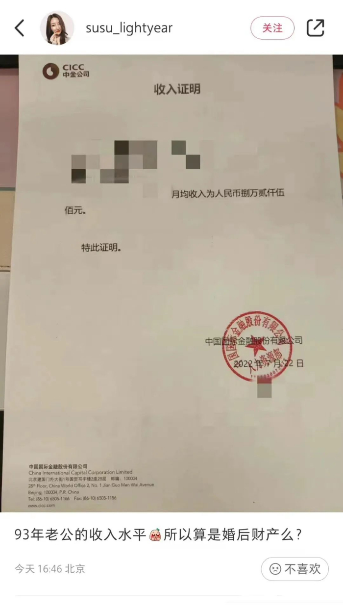 中金公司的一个员工,1993年的,他老婆就在网络上晒出自己老公月薪8万元的收入证明,还装模作样地问:“93年老公的收入水平,所以算婚后财产吗?”