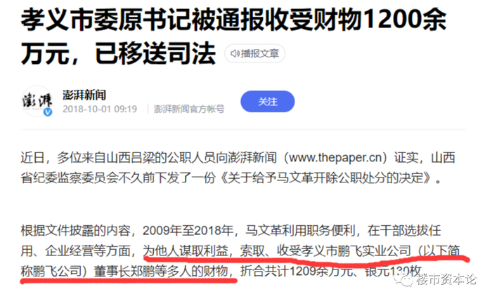 所谓树大招风。在鹏飞集团发展风头正劲时,2018年,前孝义市委书记马文革因贪腐被抓,郑鹏及鹏飞集团深度卷入。
