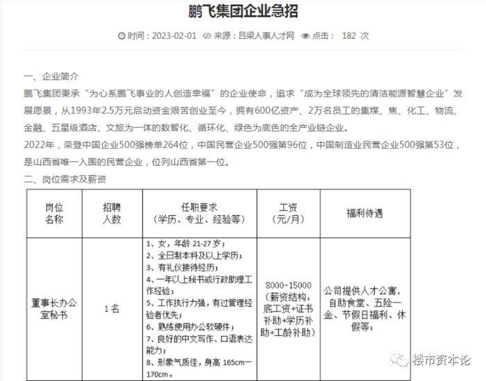 据吕梁人事人才网信息,2023年2月第1天鹏飞集团就开始企业急招,排第一名的就是董事长女秘书,要求21-27岁、身高165-170cm、形象气质佳的全日制本科及以上学历。董事长的眼光高,自然给的工资也不少。15000元的月薪,对比2021年孝义市才突破4万元的城镇人口年均收入,绝对是当地的超高薪了。