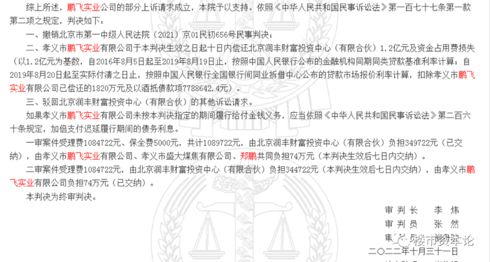 此外,鹏飞集团相关公司涉及不少借款等纠纷案件。中国裁判文书网显示,在2022年10月公布的《孝义市鹏飞实业有限公司等与北京润丰财富投资中心(有限合伙)合同纠纷二审民事判决书》中,鹏飞公司及郑鹏被判,偿还北京润丰财富投资中心1.2亿元级资金占用费损失。