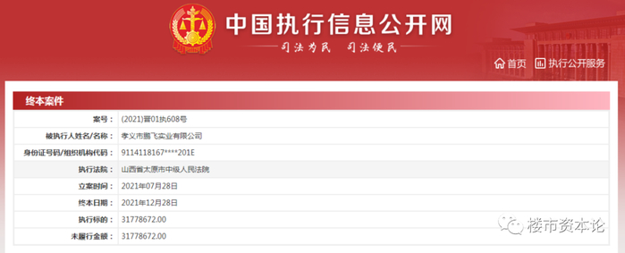 值得一提的是,同样是鹏飞实业公司,在中国执行信息公开网上也有一份执行信息,显示其自截至2021年12月28日,仍有3177万余元金额未履行。