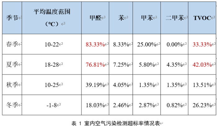 2022年6月2日,上海市室内环境净化行业协会发布新版《中国室内环境空气污染白皮书》。经过为期8个月的室内环境空气质量调研,在上海、北京、长春、济南、郑州等代表性城市,对装修两年内的1000户家庭,入户开展居室空气质量检测检测结果显示,甲醛在春季和夏季的超标率分别为83%和77%,总挥发性有机物春季和夏季的超标率分别为42%和33%。