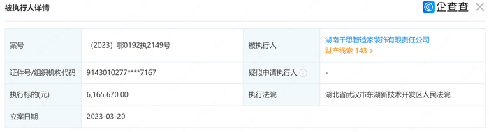 乐居财经 3月21日消息,湖南千思智造家装饰有限责任公司新增一则被执行人信息。