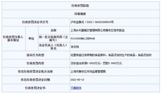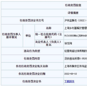 据悉,去年5月上海市市场监督管理局发布行政处罚决定书(沪市监静处〔2022〕062022000518号)。上海乡村基餐饮管理有限公司静安区恒丰路店存在以下违法行为:经营用超过保质期的食品原料、食品添加剂生产的食品、食品添加剂。上海市静安区市场监督管理局决定没收违法所得0.052万元,罚款5万元。