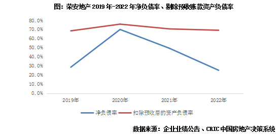 【积极回流资金,三道红线由黄转绿】截止至2022年底,荣安地产共持有现金83.9亿元,同比下降14.2%,现金短债比2.20,2022年为了回流资金,荣安地产加大项目去化销售,经营性现金流净额104.8亿元,而2021年是净流出4.0亿元,与此同时收回对外投资使得投资活动现金流净额净流入33.1亿元,同比增加439%。回流的现金偿还债款,使得现金短债比维持在较好的水平,且长短债比为2.42,偿债结构较为稳健。净负债率同比下降24.1个百分点至25.1%,剔除预收账款资产负债率同样有所改善,为68.9%满足三道红线监管要求,企业整体债务水平由黄变绿。