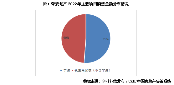 【同比下降52.0%,销售贡献近一半来自宁波】根据克而瑞《2022年中国房地产企业销售TOP200排行榜》,2022年荣安实现全口径销售金额230.5亿元,销售面积101.5万平方米,分别同比下降52.0%和46.2%,销售金额降幅大于百强房企的约42.3%的降幅。企业仅公布主要项目销售明细,因此销售分布方面,我们也按照这一数据推算。从2022年主要项目的销售分布来看,企业的主要销售项目全部来自长三角区域,其中大本营宁波占比达49%。