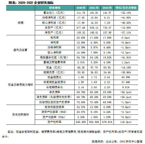 2022年荣安加强现金流管控,没有新增拿地。与此同时,通过收回对外投资,使得投资活动产生的现金流量净额较上期增加 439.03%,其长期股权投资同比下滑53.8%至24.0亿元。