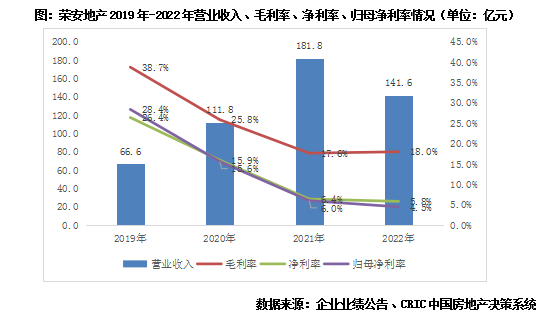 营收同比下降22.1%,地产营收占比提升至98.0%。2022年荣安地产实现营业收入141.6亿元,同比下降22.1%,营业收入下滑主要在于2022年荣安地产年度无新开工项目,在建房屋建筑面积下降 31.26%,交付面积也有所减少。收入分类来看,地产销售收入138.7亿元,同比下降20.3%,占营收比例较2021年提升2.3个百分点至98.0%,建筑施工收入1.94亿元,为企业贡献1.3%营收,另外企业还有销售代理、房屋租赁及咨询服务等业务,但收入体量较小。