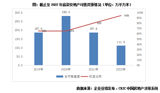【营收规模下降22%,毛利率微增】 2022年荣安地产实现营业收入141.6亿元,同比下降22.1%,营业收入下滑主要在于2022年荣安地产年度无新开工项目,在建房屋建筑面积下降 31.26%,交付面积也有所减少。实现整体毛利润约25.4亿元,同比下降20.6%,毛利率约为18.0%,同比微增0.3个百分点。在归母净利率4.5%,同比减少1.5个百分点。值得注意的是,前几年荣安快速增长的少数股东权益侵蚀了归母权益,少数股东权益占比在2019年仅为1%,到2021年增长到38%,不过随着企业合作项目逐渐销售及结转,2022年末可售资源的权益比例已经升至94%,其少数股东权益占比也落至15%,未来归母净利润占比或将得到提升。