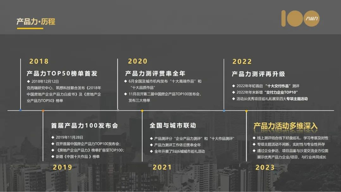 克而瑞2023产品力100·十大作品测评工作依旧贯穿全年,最终测评成果将分为半年度和年度发布,敬请持续关注。