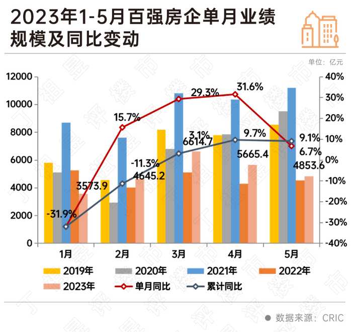 2023年5月,百强房企实现销售操盘金额4853.6亿元,环比降低14.3%,仅高于2022年水平,且为近年来5月单月业绩环比4月首度下滑。