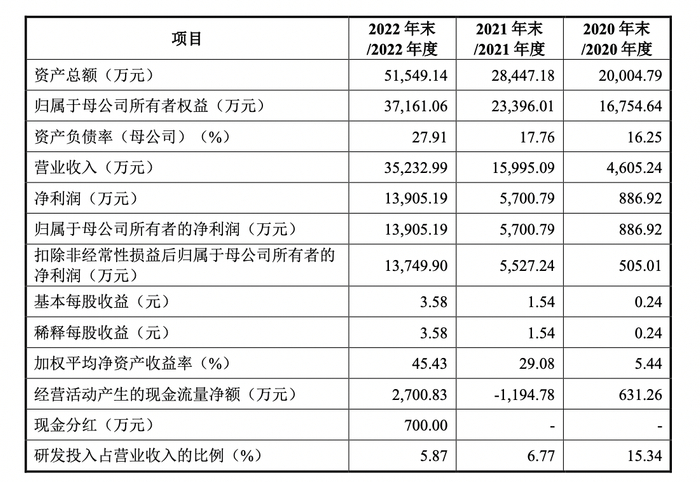 据乐居财经《预审IPO》查阅招股书,2020年-2022年,赢双科技实现营业收入分别为4605.24万元、1.6亿元、3.52亿元;归属于母公司所有者的净利润分别为886.92万元、5700.79万元、1.39亿元。