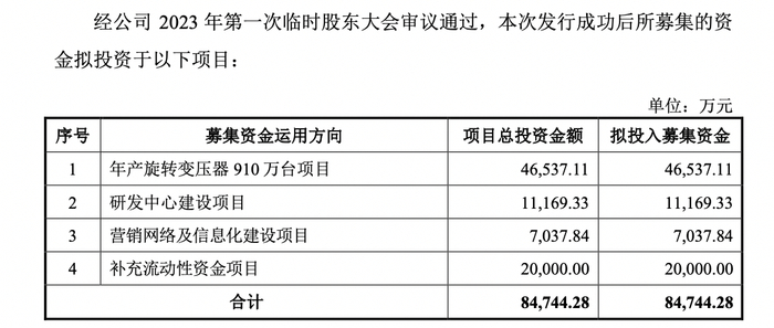 募资当中,4.65亿元用于年产旋转变压器910万台项目,1.12亿元用于研发中心建设项目,7037.84万元用于营销网络及信息化建设项目,2亿元用于补充流动性资金项目。
