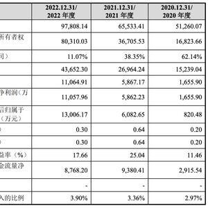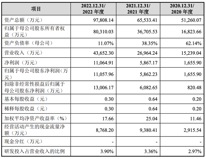 公司最近三年营业收入分别为15,239.04万元、26,964.24万元和43,652.30万元,其中,2021年度和2022年度增长幅度分别为76.94%、61.89%;扣除非经常性损益后归属于母公司股东的净利润分别为820.48万元、6,082.65万元和13,006.17.12万元。