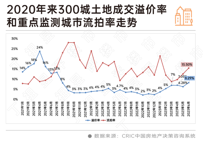 上半年,楼市增长动能持续放缓,房企现金流并未得到明显改善,房企的投资策略也高度聚焦核心城市。在此背景下,整体土拍市场热度有所回升,上半年整体溢价率增至15.5%,较2022年同期上升了6.5个百分点。