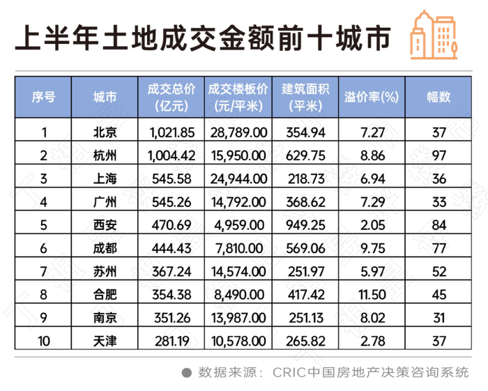 上半年卖地揽金超千亿的城市有2个,分别是北京和杭州,成交金额为1022亿元和1004亿元,其中北京的成交金额较去年同期接近持平,微降1%,杭州跌幅则高达33%。