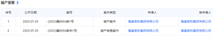 地产密探获悉,7月25日,“(2023)冀0684破1号”破产重整的申请人和被申请人均为隆基泰和集团,该情况的确有别于其他房企,经办法院为河北高碑店法院。