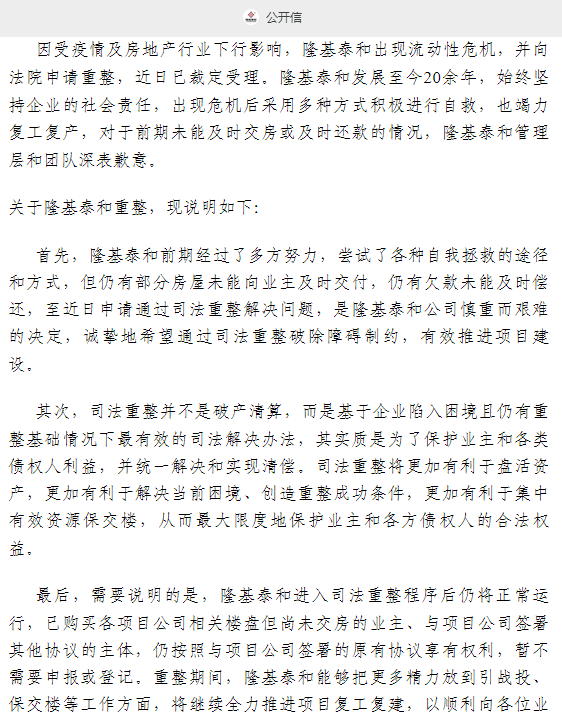 透过公开信,外界可以获得几个关键信息:其一,隆基泰和因流动性危机而主动申请司法重整;其二,强调重整不是破产,后续仍将正常运行;其三,重整期间,更多精力会放到引战投、保交楼等。