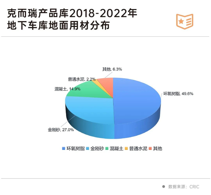 从克而瑞产品库近年来的数据我们发现,环氧树脂地坪几乎占到一半,其次为金刚砂和混凝土,分别占比27%和14.9%。