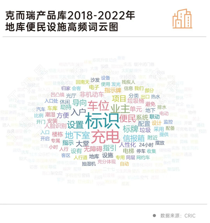 例如,预装充电桩、手机信号全覆盖、设置便民标识及楼栋指引牌、配备凹凸镜、信报箱、垃圾桶、空间无障碍设施、抽/除湿机、墙柱分色分区指示等等。