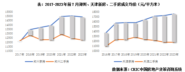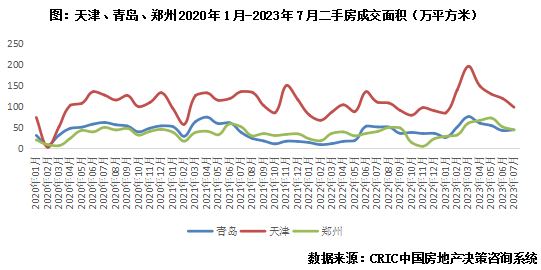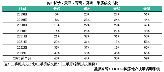 表:天津、青岛、郑州2023年前7月一二手房成交占比