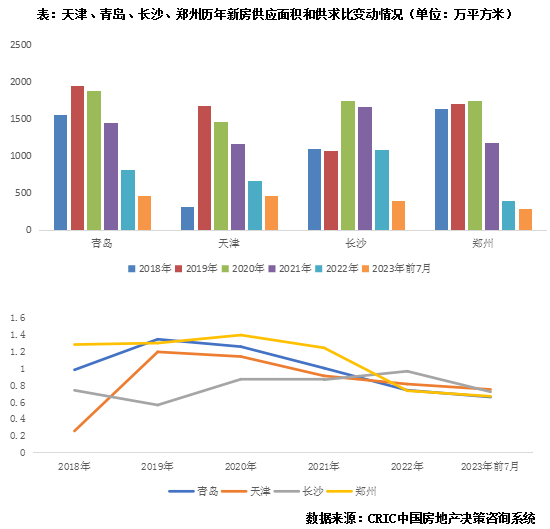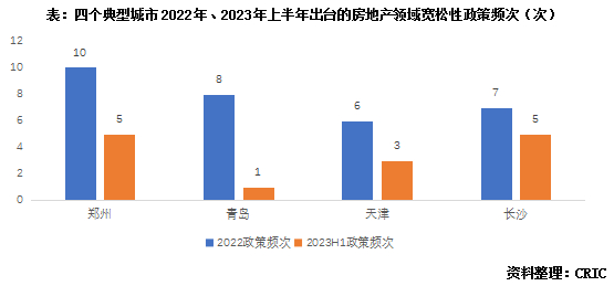 四城中,郑州、长沙政策出台频次最高,各有5次宽松性政策落地,排在全国城市的前10位。天津有5月相继出台公积金和土拍新政,加上四月的落户政策松绑也将侧面影响房地产市场。而青岛作为2022年出台过8次新政、频次排名全国第5位的城市,今年上半年政策发布节奏放缓,仅在6月调整过相关政策。