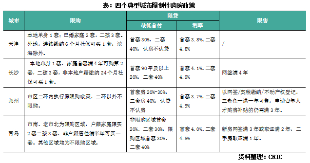 四个典型城市现行限制性购房政策由严到松排序:长沙、青岛、天津、郑州。一度以调控严苛著称的长沙,即便历经多轮政策松绑,也是四城中限制性政策最多的,就拿限购来说,其他三城户籍居民都可以买两套,而长沙首套满4年才能买第二套,非户籍更是需要满24个月才能购房,反观天津、青岛购房的社保或居住年限要求都已调降至6个月。购房政策门槛最低的当属郑州,首套房最低2成起、认贷不认房,以及低至3.7%的首套房贷利率,都为促进刚需购房提供了有利条件。