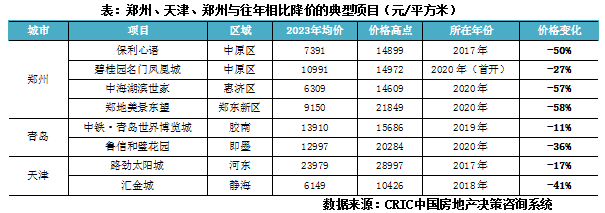 从项目层面来看,郑州价格战持续加剧,主城和环郑网签价格下调项目占比均在55%以上,价格下调幅度在10-2500元/平方米不等。青岛鲁信和璧花园、天津金地水西印等项目2023年的销售价格,与曾经的高点相比下降了3成以上。