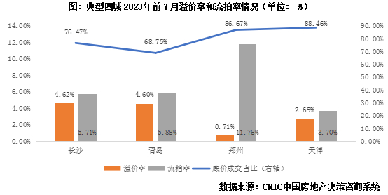 从各城市土拍情况来看,2023年以来基本保持着相对惨淡的行情。具体体现在以下三方面:一是四城均以底价成交为主,成交占比均在65%以上。二是从前7月各城市溢价率来看,均在5%以内,且拿地主要以国央企和优质民企为主,房企对于这些城市投资相对谨慎,持观望态度。三是从前7月流拍率来看,天津流拍率最低也达到了4%,长沙、青岛持稳在6%,而郑州高达12%,34宗地块中有4宗流拍,地市惨淡程度可见一般。