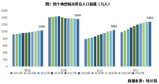 人口层面来看,四城均为千万人口大市,截至2022年末,天津、郑州人口在1300万左右,青岛、长沙人口也在1000万以上。