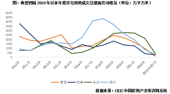 2023年上半年,集中供地政策优化,由“双集中”供地变为“拟供应清单”模式,重点城市受提质减量供地策略的影响,入市地块数量减少,成交规模走低。据CRIC监测,青岛、长沙、郑州2023年前7月涉宅用地成交规模均不及2022年全年41%,基本都创了前7月同期新低;仅天津加强了供地强度,今年上半年涉宅用地成交规模高达260万平,占2022年全年65%。