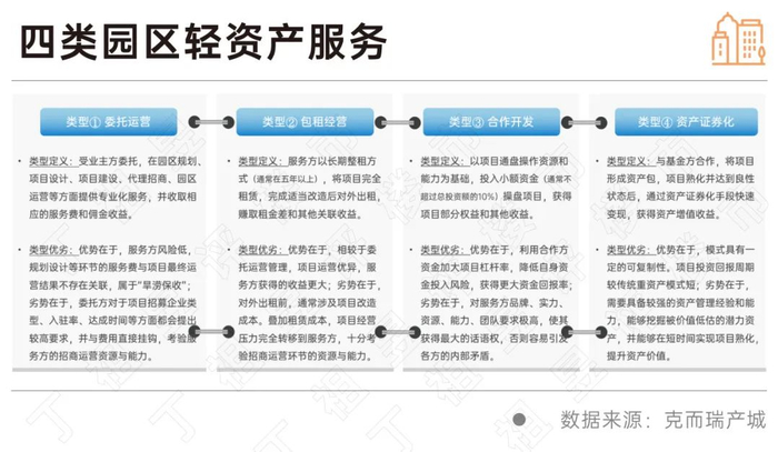 根据合作模式不同,园区轻资产服务可以分为四类,核心都是招商运营环节的资源、能力和项目实操经验。