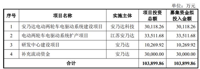 招股书显示,安乃达本次拟投资项目的投资总额为10.39亿元,拟投入募资10.39亿元,主要募投项目分别是安乃达电动两轮车电驱动系统建设项目、电动两轮车电驱动系统扩产项目、研发中心建设项目、补充流动资金。