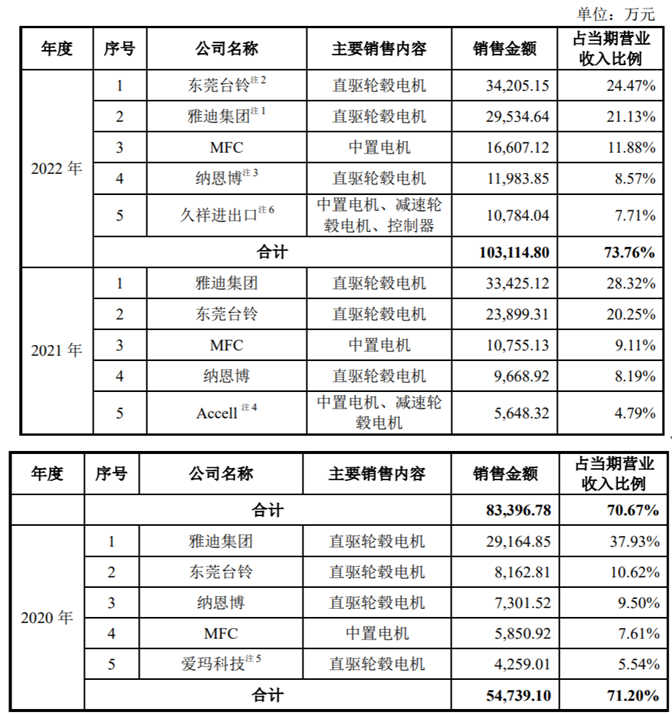经过多年的发展,公司已与雅迪、爱玛、台铃、MFC、Accell等国内外知名电动两轮车品牌商建立了稳定的业务合作关系。报告期内,公司来自前五大客户的收入占比分别为71.20%、70.67%和73.76%,前五大客户收入占比处于较高水平。
