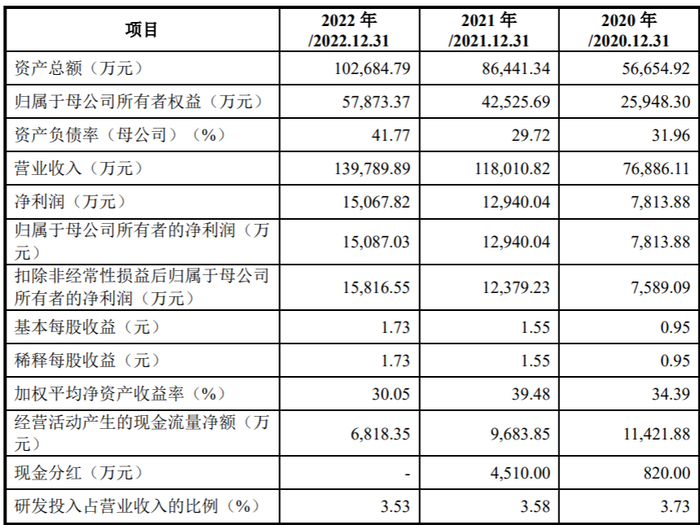 业绩方面,2020年、2021年及2022年(下称“报告期内”),公司实现营业收入分别为76,886.11万元、118,010.82万元和139,789.89万元,最近三年年均复合增长率为34.84%;实现归属于母公司股东净利润(扣除非经常性损益后孰低)分别为7,589.09万元、12,379.23万元和15,087.03万元,最近三年年均复合增长率为41.00%。