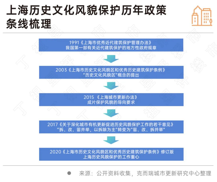 无论是出于城市形象的构建还是历史文化的传承,对于历史文化风貌的保护都是必要的,上海市政府也历来注重历史风貌的保护和传承。从保护政策的沿革演变来看,上海市历史文化风貌保护工作有着由点及面,由散到整,由粗到精的推进方向与发展趋势。