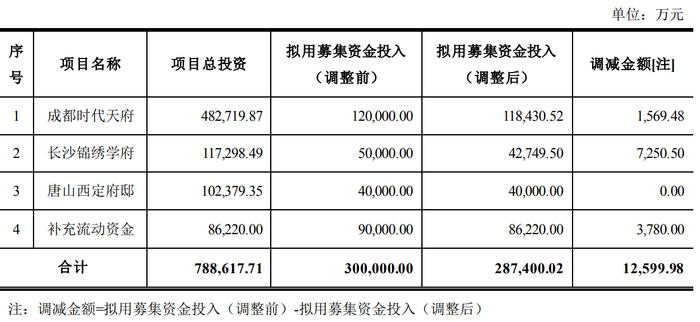 最初的非公开发行A股股票预案显示,非公开发行股票数量不超过13.04亿股(含),非公开发行股票数量上限未超过本次发行前公司总股本的30%,全部由发行对象以现金认购。荣盛发展本次非公开发行募集资金总额预计不超过30亿元(含本数),扣除发行费用后将用于以下成都时代天府、长沙锦绣学府、唐山西定府邸项目,另外9亿元用于补充流动资金。