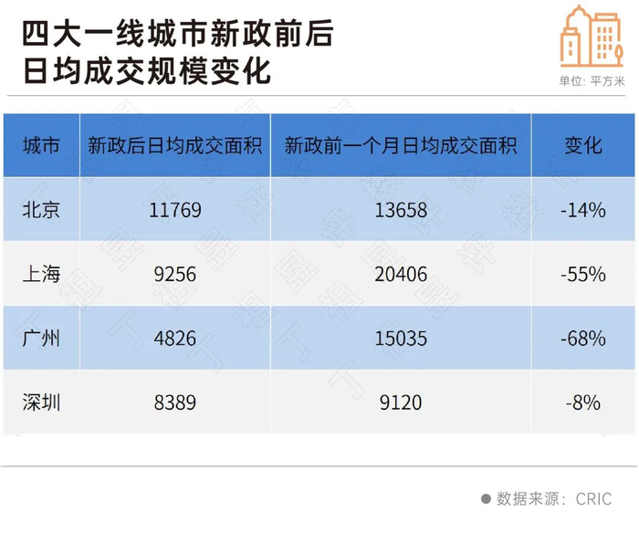 从新政出台后日均成交数据来看,效果并未十分明显。四大一线城市新政后两周日均成交规模较新政前一个月日均成交规模均有不同程度的下跌。
