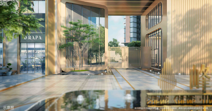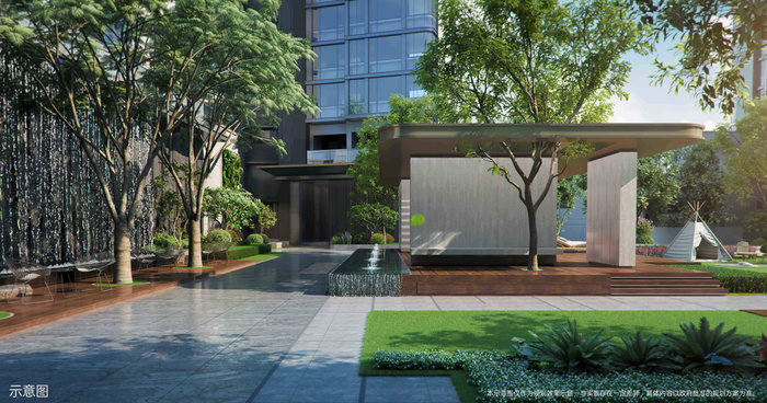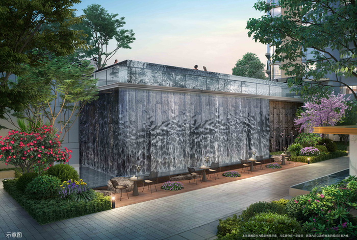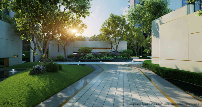 观赏性方面,以归家大门为例,景观树阵+对景景墙+轻奢优雅大门+潺潺水景,一步一景。