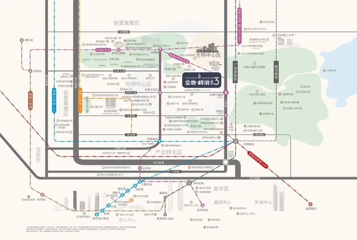 项目位于光明凤凰城板块,距光明高铁站仅200米,该站点前往福田高铁站仅需20分钟左右,对于依靠高铁通勤至深圳的上班族非常友好。