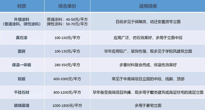 简单科普下,目前市面上常用的外立面材料大致有7种,按成本从高至低排序:玻璃幕墙>干挂石材>铝板>保温一体板>真石漆>面砖>涂料。