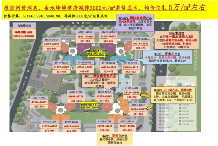 项目预计9月下旬取证,推售1543套房源,产品为约82-108㎡3-4房,网传单价3.8万/㎡起,送精装。