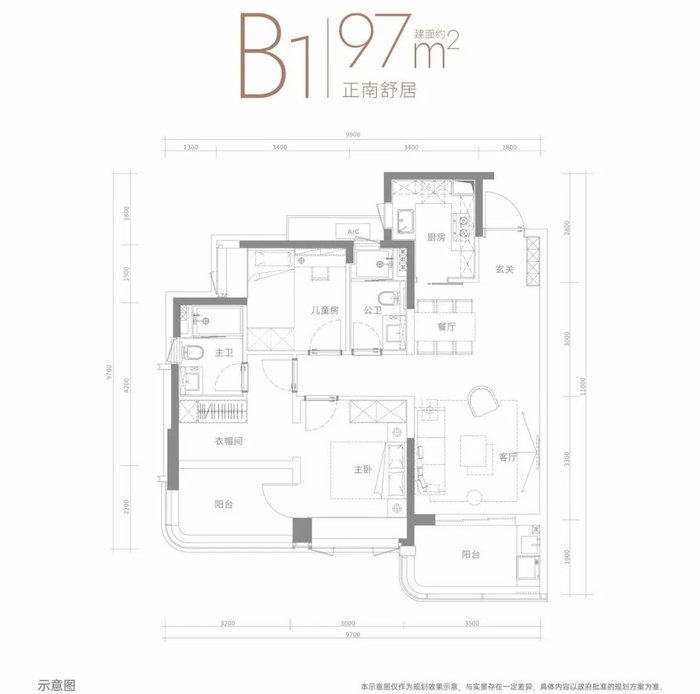 97㎡:正南朝向,南向开间约3.5米观景阳台,全屋卧室开间均达约3米,主卧套房设计,带独立卫生间