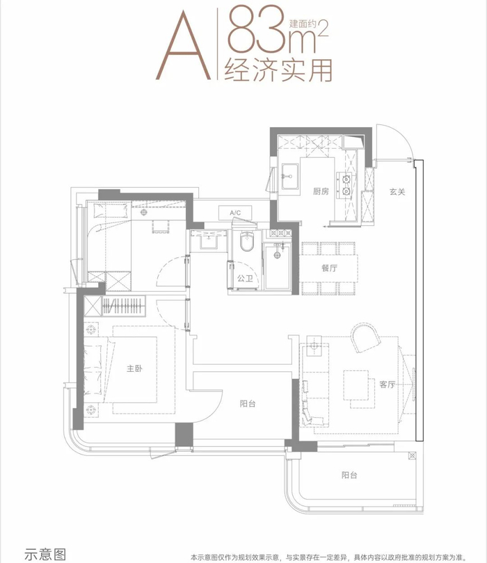 83㎡:全明户型,餐客一体竖厅设计,客厅开间约3.4米,宽景阳台约3.4米